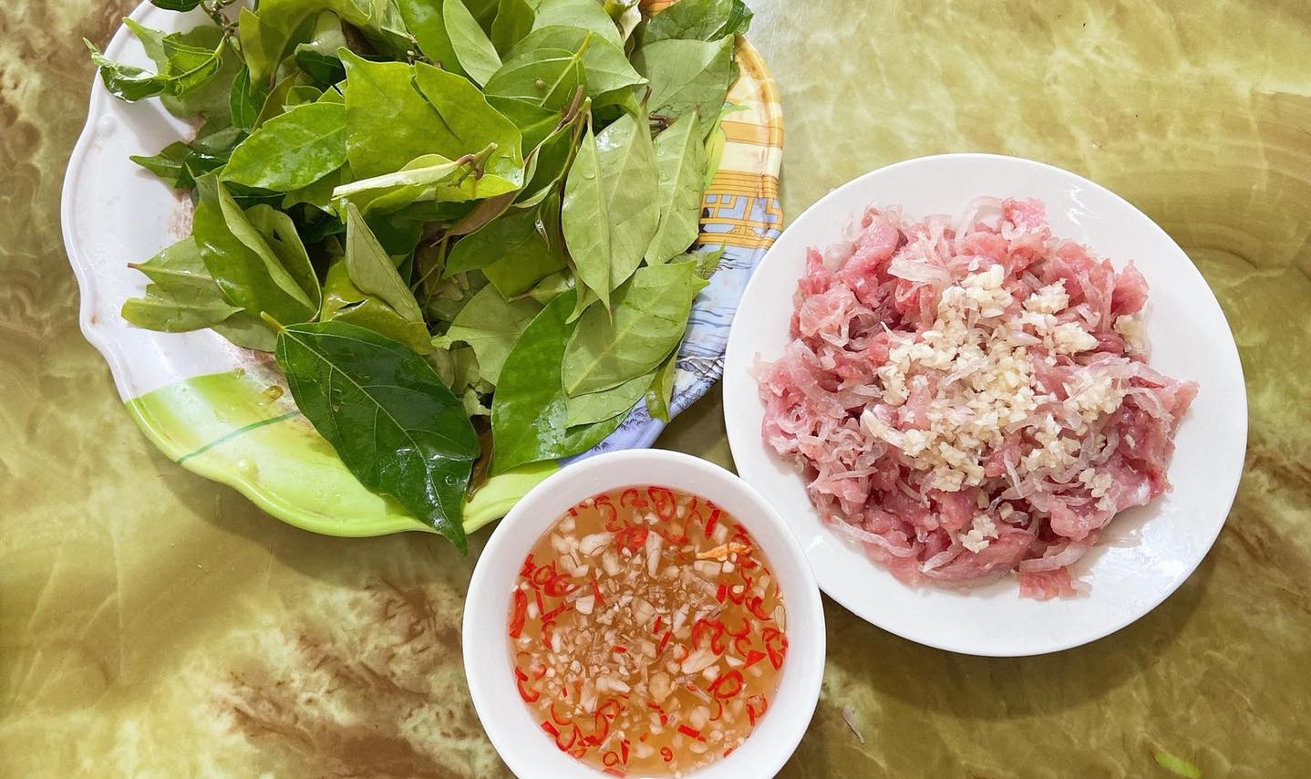 Khi ăn gỏi nhệch, các loại lá quan trọng như lá mơ, sắn thuyền, lá bứa, lá đinh lăng cần phải có đầy đủ, ngoài ra có thể dùng kèm thêm chút rau gia vị như: mùi ta, các loại húng, khế chua, chuối xanh… Khi ăn, các bạn sẽ gói các loại rau này cho vào bánh đa nem, cuộn thêm với một gắp gỏi nhệch trộn giềng và gia vị, cuốn lại cho chặt tay rồi chấm vào bát bỗng. Tính a-xít của dấm sẽ khiến phần thịt cá chín dần dần mà không cần phải xử lý qua nhiệt.